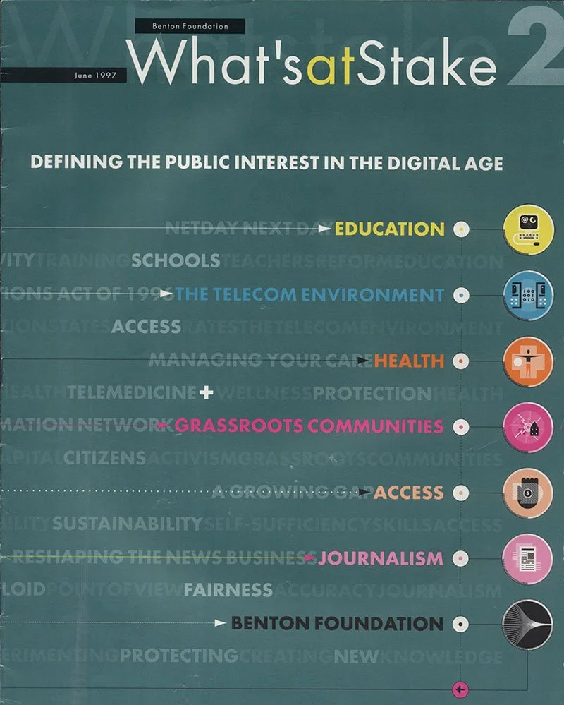 Benton became a trusted guide in the emerging digital communications environment, an architect of a public interest vision for the information age, and a leading nonprofit Internet publisher. As a grantmaker and grantseeker, media producer, communications policy analyst and technology developer, we worked in three interdependent areas: