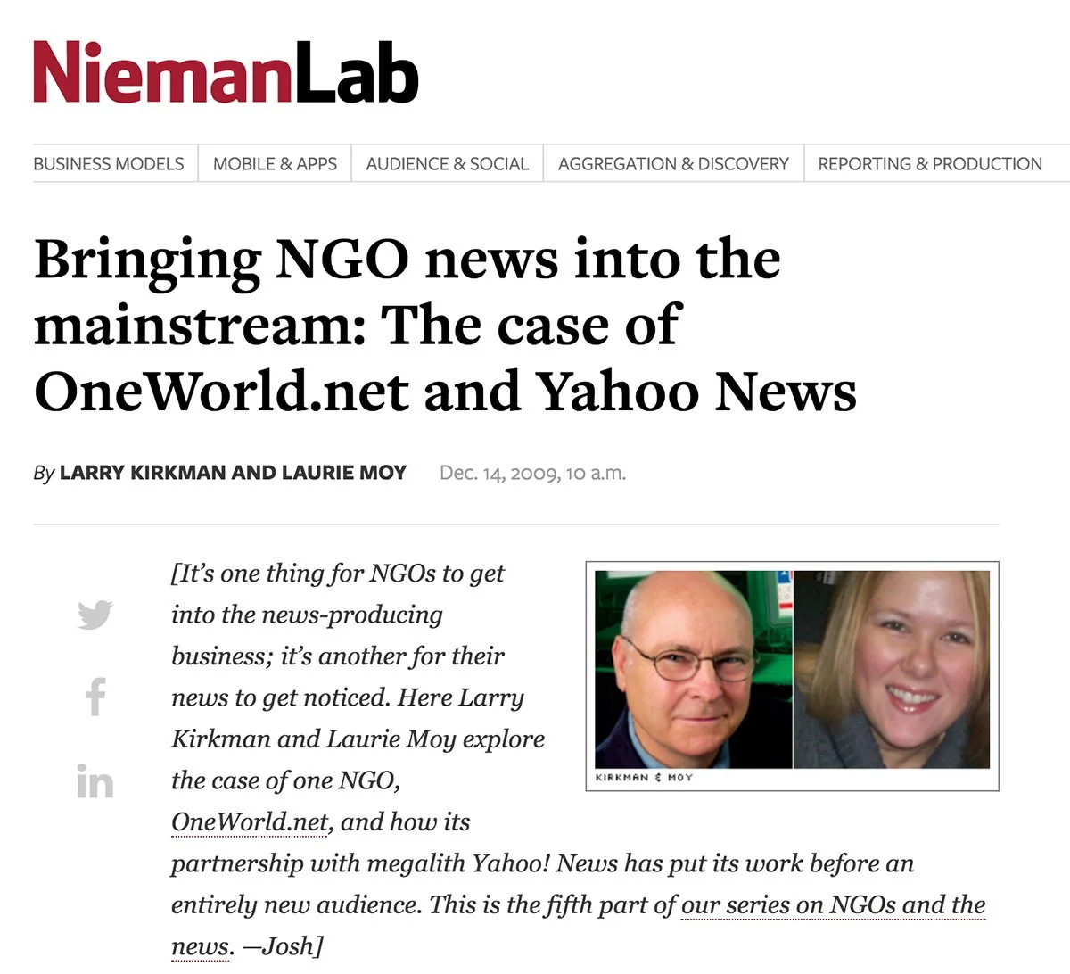 I worked with the founders of One World, Anuradha Vittachi and Peter Armstrong, to provide policy direction and fundraising for this global multimedia collaborative of 13 One World centers. From Finland to Spain, India to Zambia, One World tapped into the knowledge and networks of more than 6,500 partner organizations working for human rights, sustainable development and social justice, including NGOs, development-oriented news services, foundations and research institutions. With core funding from the Ford Foundation, and project support from The MacArthur Foundation, Omidyar Network and Open Society Institute, OneWorld realized the network effect for civil society in the emerging digital landscape.