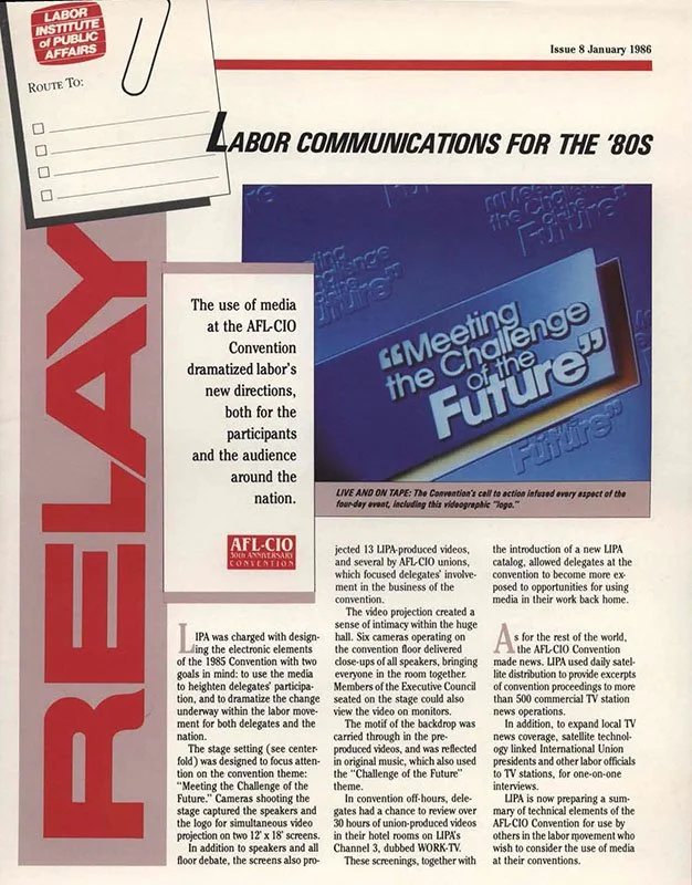 LIPA produced guidebooks and held workshops and conferences on labor’s use of cable TV, media relations, videoconferencing, and advertising, and published Relay, a quarterly newsletter.